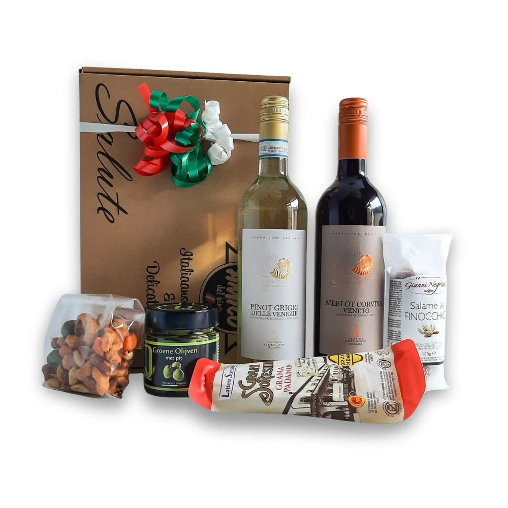 Laat iemand (of jezelf) genieten van de smaak van Italië met dit luxe cadeaupakket. Vol heerlijke Toscaanse salami, 125 g Gana Padano kaas, 260 g smaakvolle Italiaanse groene olijven en 100 g verse, gebrande noten. Compleet gemaakt met een fles rode Vastelnuvo Merlot en een fles witte Castelnuovo del Garda, voor een complete culinaire ervaring. Perfect om samen van te genieten of als bijzonder cadeau voor elke gelegenheid.